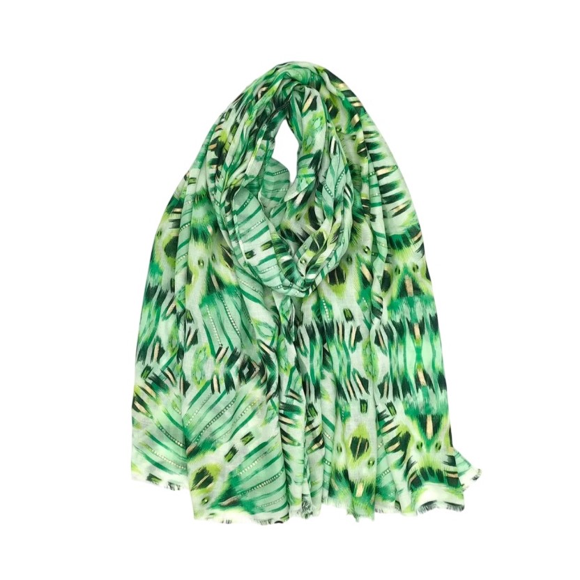 Φουλάρι με έθνικ print & lurex σε πράσινη απόχρωση. Εξαιρετικής ποιότητας και υφής, ιδανική επιλογή για ανάλαφρες καλοκαιρινές εμφανίσεις!