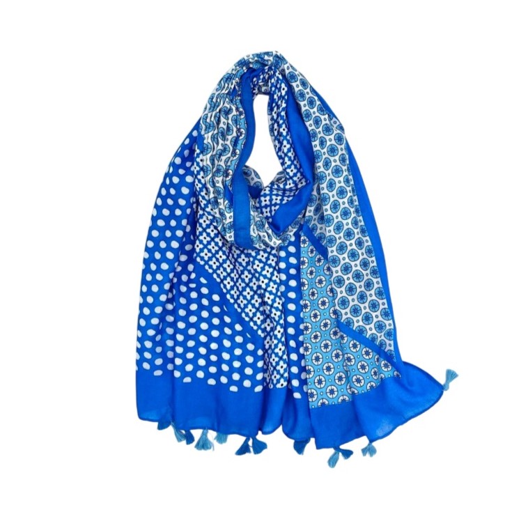Φουλάρι-παρεό με multi print μοτίβο και φούντες σε μπλε χρώμα. Μαλακό στην υφή και με βαμβάκι στη σύνθεσή του, θα σας χαρίσει χρώμα και στυλ σε κάθε σας εμφάνιση!